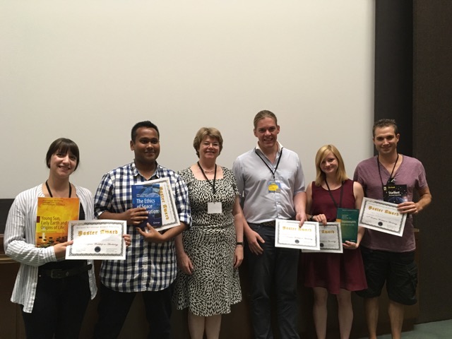 poster awards. From left to right: Jean-Pierre de Vera2 (for awardee Dennis Höning1), Gerda Horneck3, Frances Westall3, Casey Bryce1, Maximilian Mora1, Tetyana Milojevic1, Bo Byloos1and Dominic Papineau2 (for awardee Matthew S. Dodd1). Image courtesy of Natasha Nicholson. |