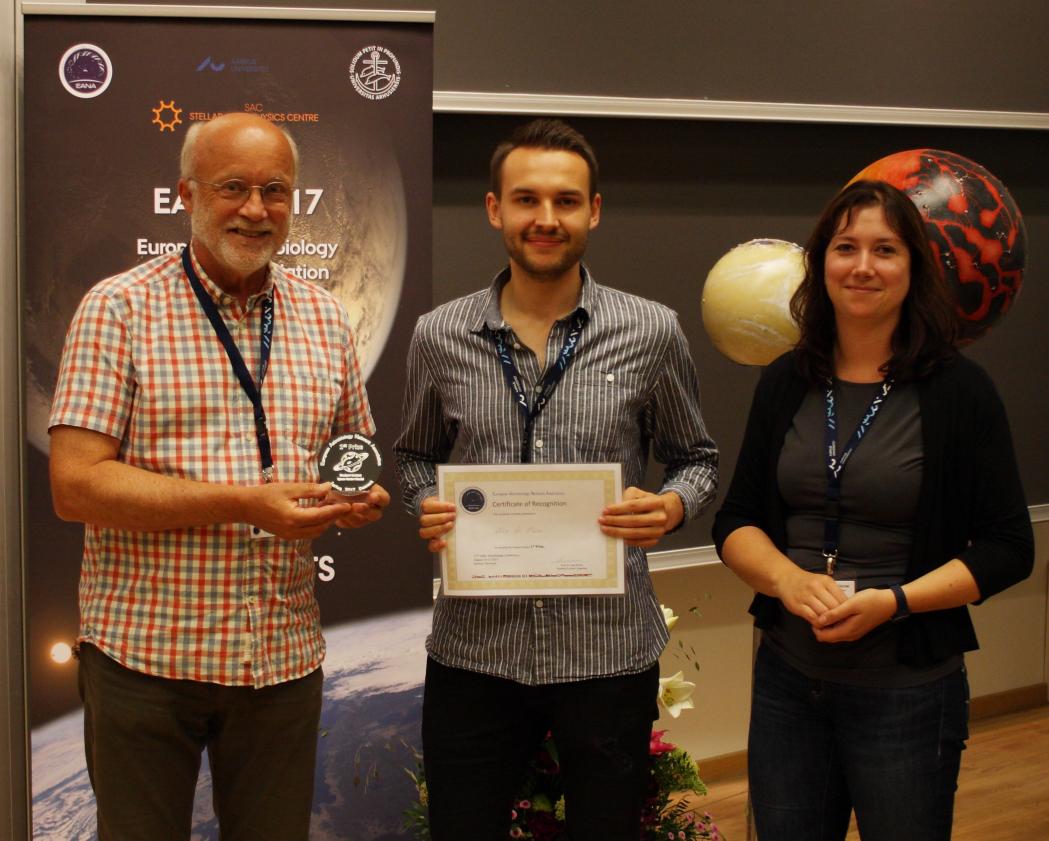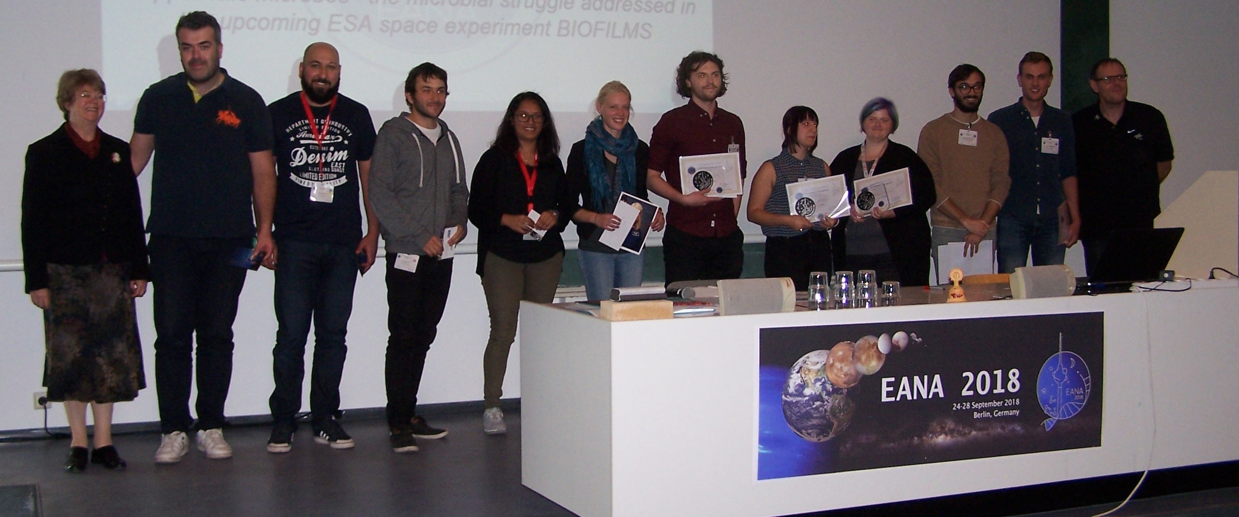 During EANA 14, the 64 posters were evaluated by a distinguished team of astrobiologists consisting of Lewis Dartnell (UK), Kai Finster (Denmark), Kensei Kobayashi (Japan), Kirsi Lehto (Finland), Manesh Patel (UK) and Henry Strasdeit (Germany).Thanks to the generosity of the publishers Springer and Cambridge University Press, each awardee received a recent book topical to astrobiology in addition to the poster prize document. The winners were awarded by EANA`s President Frances Westall and Honorary President Gerda Horneck during the closing session of EANA 14.